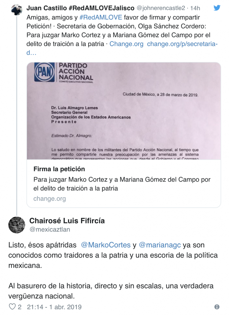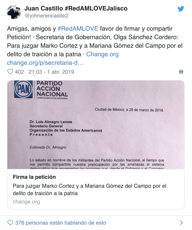 Luego de que Marko Cortés, líder nacional del PAN y su colega de partido, Mariana Gómez del Campo emitieran una “alerta internacional” y posteriormente una carta a la Organización de Estados Americanos (OEA), usuarios de redes sociales han creado una petición en la plataforma Chance.org para que estos dos conservadores sean juzgados por traición a la patria.