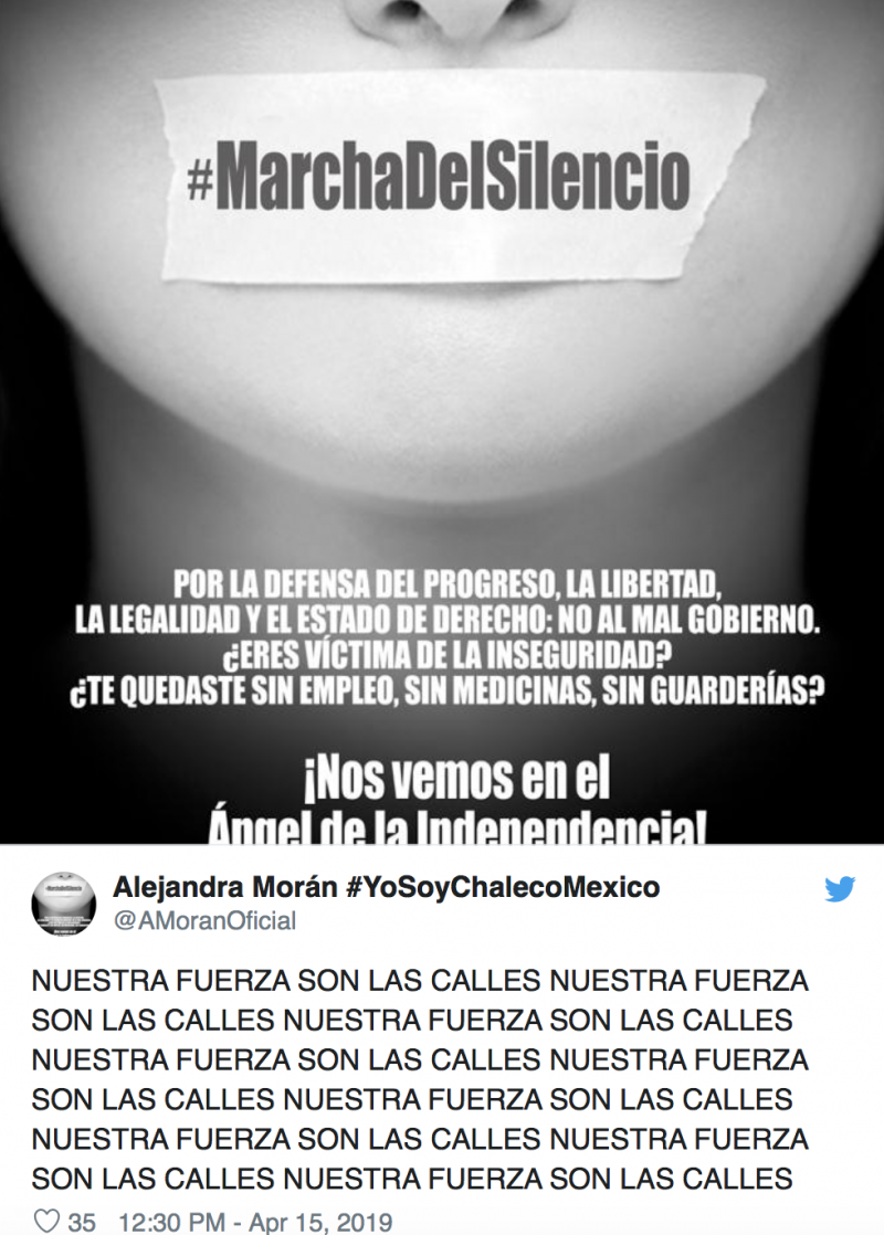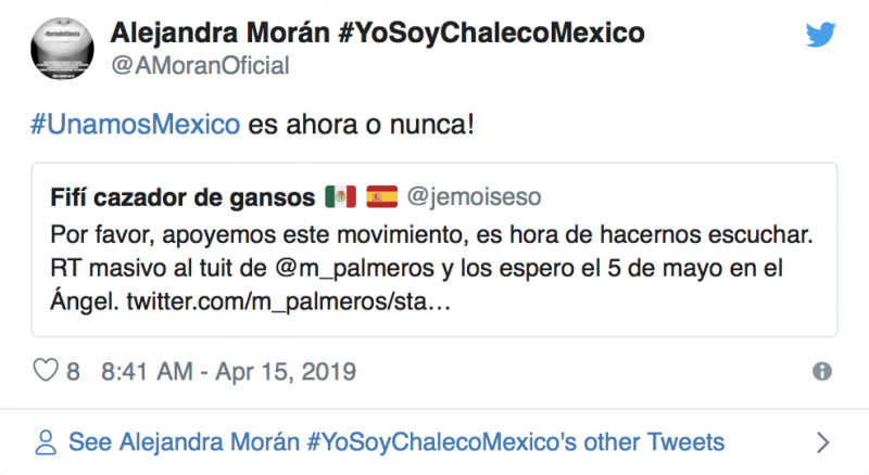 A través de una serie de publicaciones en su cuenta de Twitter, la fundadora del grupo, la actriz Alejandra Morán, señaló que ‘este no es el gobierno que merece nuestro país’; mientras convoca a más gente a unirse a esta protesta en contra de lo que ellos consideran la mala administración de Andrés Manuel López Obrador.