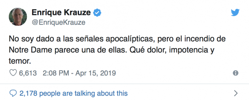 El historiador Enrique Krauze se ha unido en redes sociales a los lamentos por el terrible incendio, sin embargo se ha llenado de burlas debido a sus peculiares declaraciones, en las cuales califica al hecho como “una señal apocalíptica.
