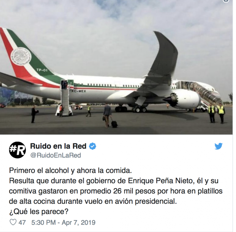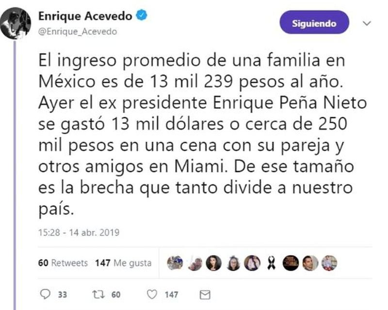 El ingreso promedio de una familia en México es de 13 mil 239 pesos al año. Ayer el expresidente Enrique Peña Nieto se gastó 13 mil dólares o cerca de 250 mil pesos en una cena con su pareja. De ese tamaño es la brecha que tanto divide a nuestro país”.