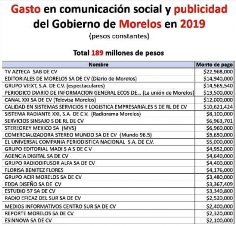 Le siguen la empresa que edita el Diario de Morelos, con 14 millones 940 mil pesos, y una empresa de espectaculares, Grupo Viext, SA de CV, con un monto de 14 millones 565 540.