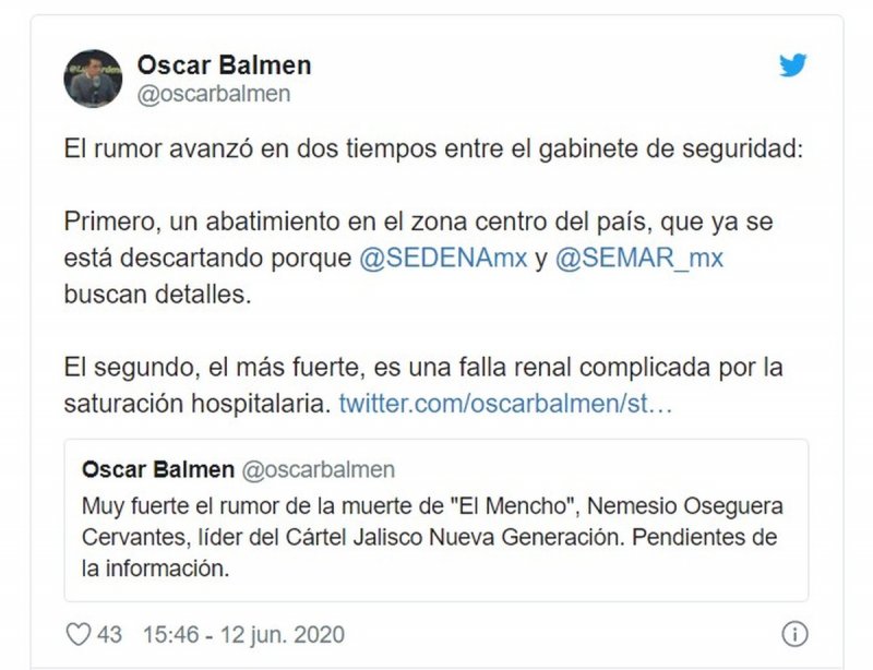 Mientras que el periodista Oscar Balmen, precisó que su la muerte de El Mencho fue por padecimientos renales. El caso es una incógnita total, sin embargo esta no es la primera vez que circula la versión de la muerte de Oseguera Cervantes.
