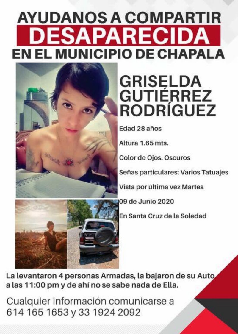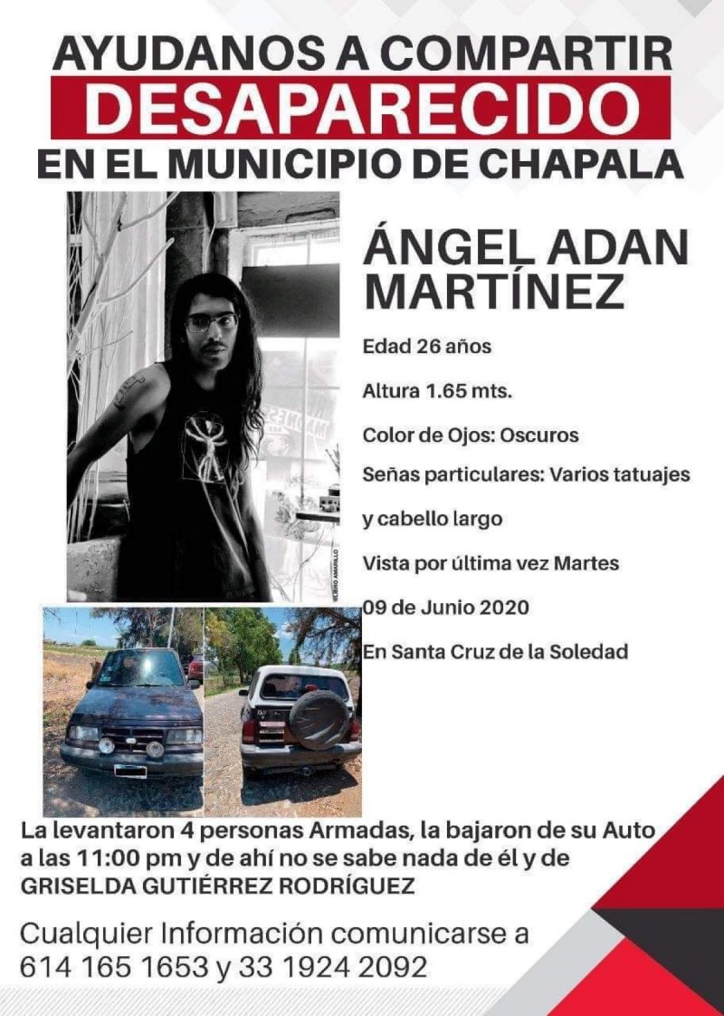 El municipio de Chapala se convirtió en un foco rojo por desaparición de personas, pues van ocho casos registrados solo esta semana. Es lo que ocurrió con Griselda Gutiérrez Rodríguez y Ángel Adán Martínez, dos jóvenes artistas que fueron desaparecidos por sujetos armados este 9 de junio, denuncia la madre del artista.
