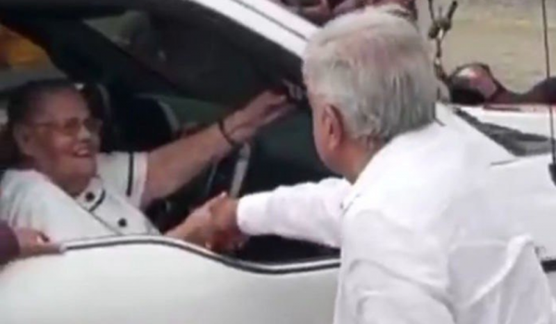 Las imágenes difundidas en un video muestran a la señora Loera a bordo de una camioneta, mientras el Presidente se dirige a saludarla. Pese a las medidas de sana distancia impulsadas desde entonces por la Secretaría de Salud, López Obrador saludó de mano a la mujer.