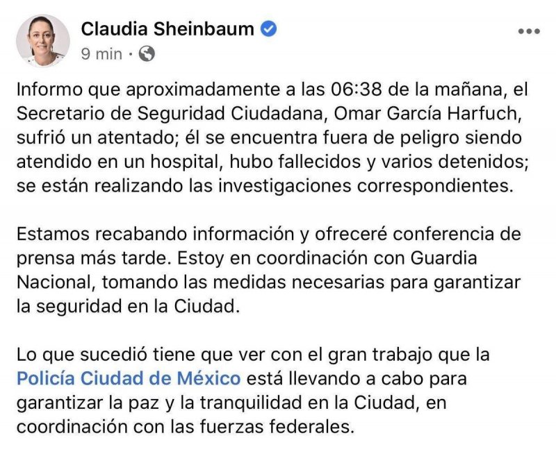 Confirmo que el Secretario de Seguridad Ciudadana @OHarfuch está bien y fuera de peligro. Lo que sucedió tiene que ver con el gran trabajo que la @SSC_CDMX está llevando a cabo para garantizar la paz y la tranquilidad en la Ciudad, en coordinación con las fuerzas federales.