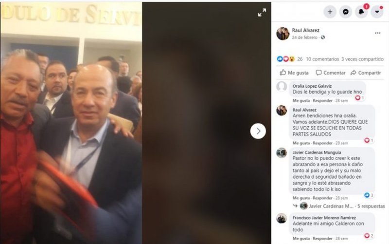 El medio mencionado dio a conocer que el líder religioso presumió en su perfil de Facebook fotos de la asamblea del 24 de febrero, que se realizó en el World Trade Center, en una de las cuales aparece abrazando a Calderón.