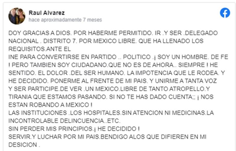Al pie de la foto, el pastor escribió: “Doy gracias a Dios por haberme permitido ir y ser delegado nacional del distrito 7 por México Libre, que ha llenado los requisitos ante el INE para convertirse en partido político. ¡Soy un hombre de fe! Pero también soy ciudadano, que no es de ahora, ¡siempre! He sentido el dolor del ser humano, la impotencia que le rodea, y he decidido ponerme al frente de mi país y unirme a tanta voz y ser partícipe de ver un México Libre de tanto atropello y tiranía que estamos pasando. Si no te has dado cuenta, ¡nos están robando a México!”.