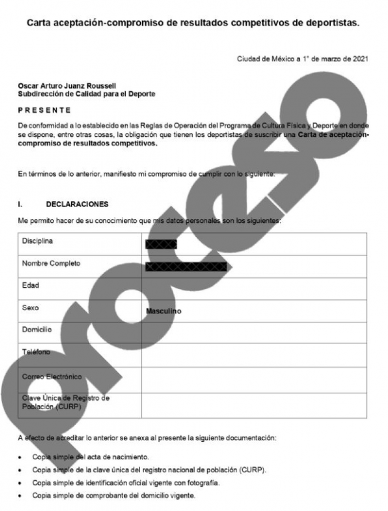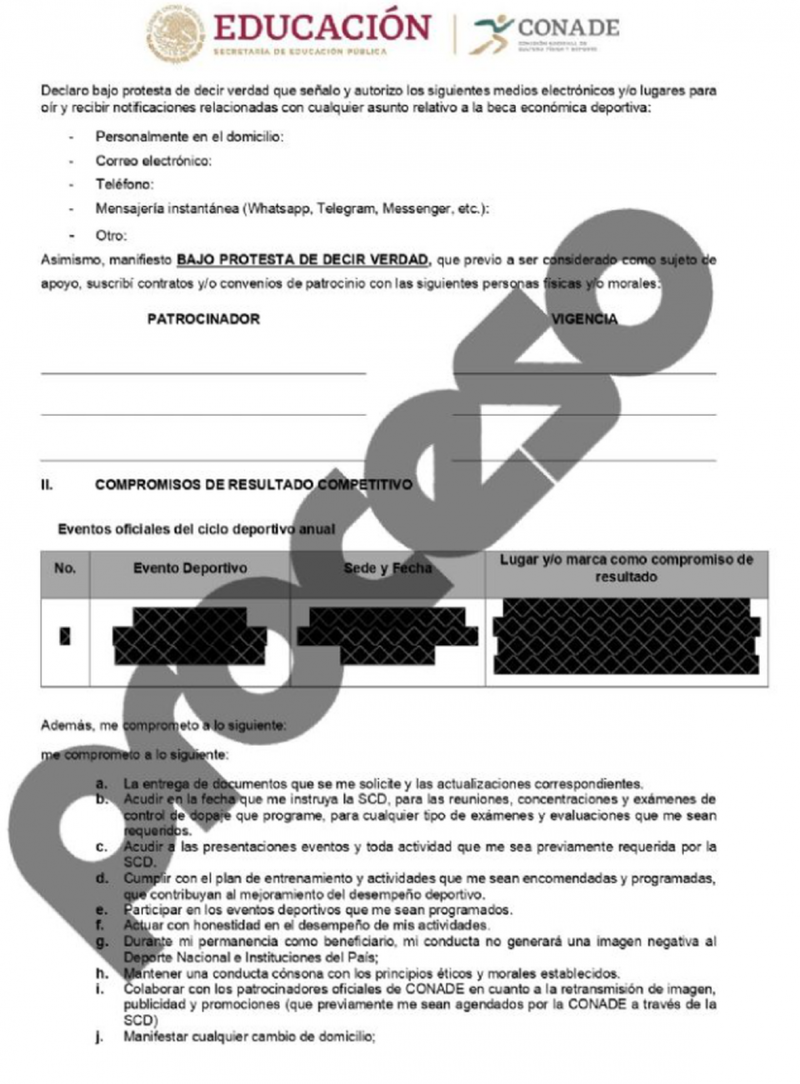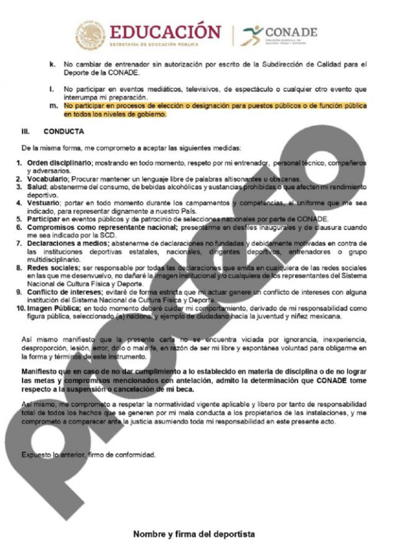 El documento es una copia al carbón de la carta que los deportistas mexicanos han firmado históricamente desde que existía el fideicomiso Fondo para el Deporte de Alto Rendimiento (Fodepar), con excepción de un inciso nuevo que indica que se comprometen a “no participar en procesos de elección o designación para puestos públicos o de función pública en todos los niveles de gobierno” .