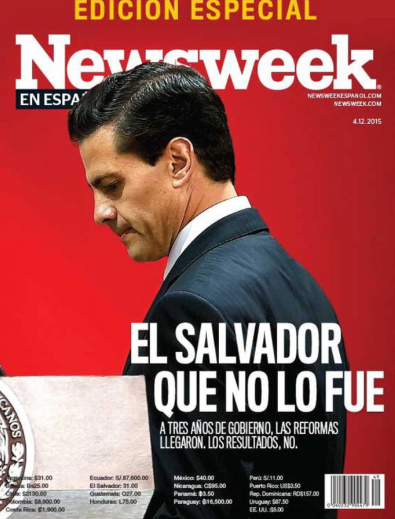 Para 2015, la percepción de este panorama había cambiado completamente y fue la revista Newsweek la que dedicó otra portada al ex mandatario: “El Salvador que no fue”, se leía en grandes letras blancas.Para ese entonces ya habían desaparecido 43 estudiantes de la Escuela Normal Rural de Ayotzinapa, uno de los episodios más violentos que se han registrado en el país. Además “a mitad del sexenio, el gobierno de Enrique Peña Nieto fracasa en su propósito de abatir los índices de pobreza. Su gabinete se ha visto inmerso en escándalos de corrupción e impunidad, que comienzan con la propia figura del Presidente. Tres años bastaron para destrozar la esperanza que muchos depositaron en el retorno del Partido Revolucionario Institucional (PRI)”, escribió Albison Linares.