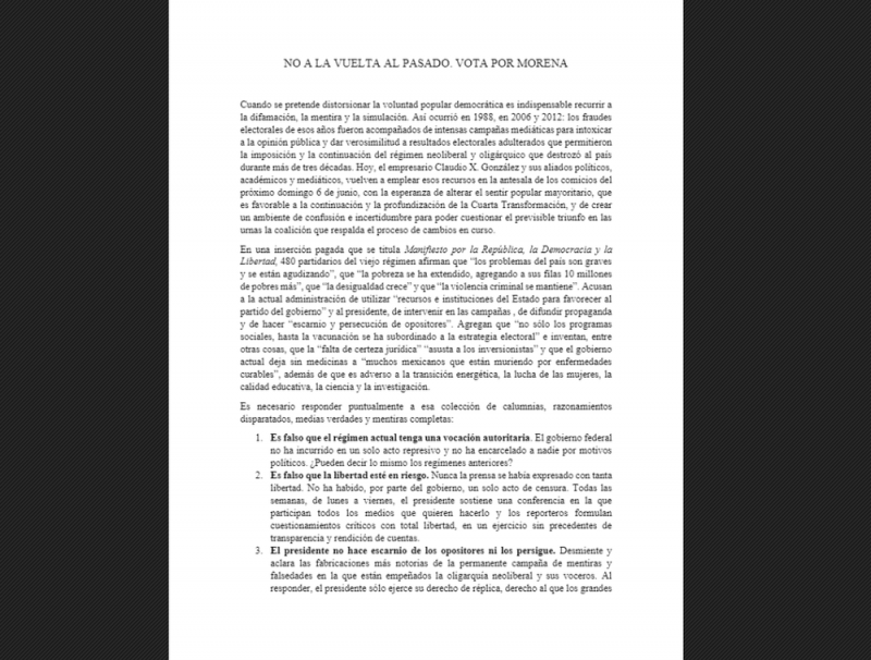 “El empresario Claudio X. González y sus aliados políticos, académicos y mediáticos, vuelven a emplear esos recursos en la antesala de los comicios del próximo domingo 6 de junio, con la esperanza de alterar el sentir popular mayoritario, que es favorable a la continuación y la profundización de la Cuarta Transformación, y de crear un ambiente de confusión e incertidumbre para poder cuestionar el previsible triunfo en las urnas la coalición que respalda el proceso de cambios en curso”, expusieron en el escrito con fecha del 1 de junio.