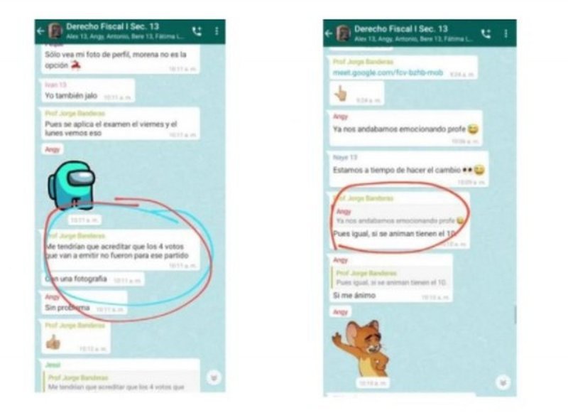 En las capturas se ve como extorsiona a los alumnos para que voten contra morena a cambio de una buena calificación.
