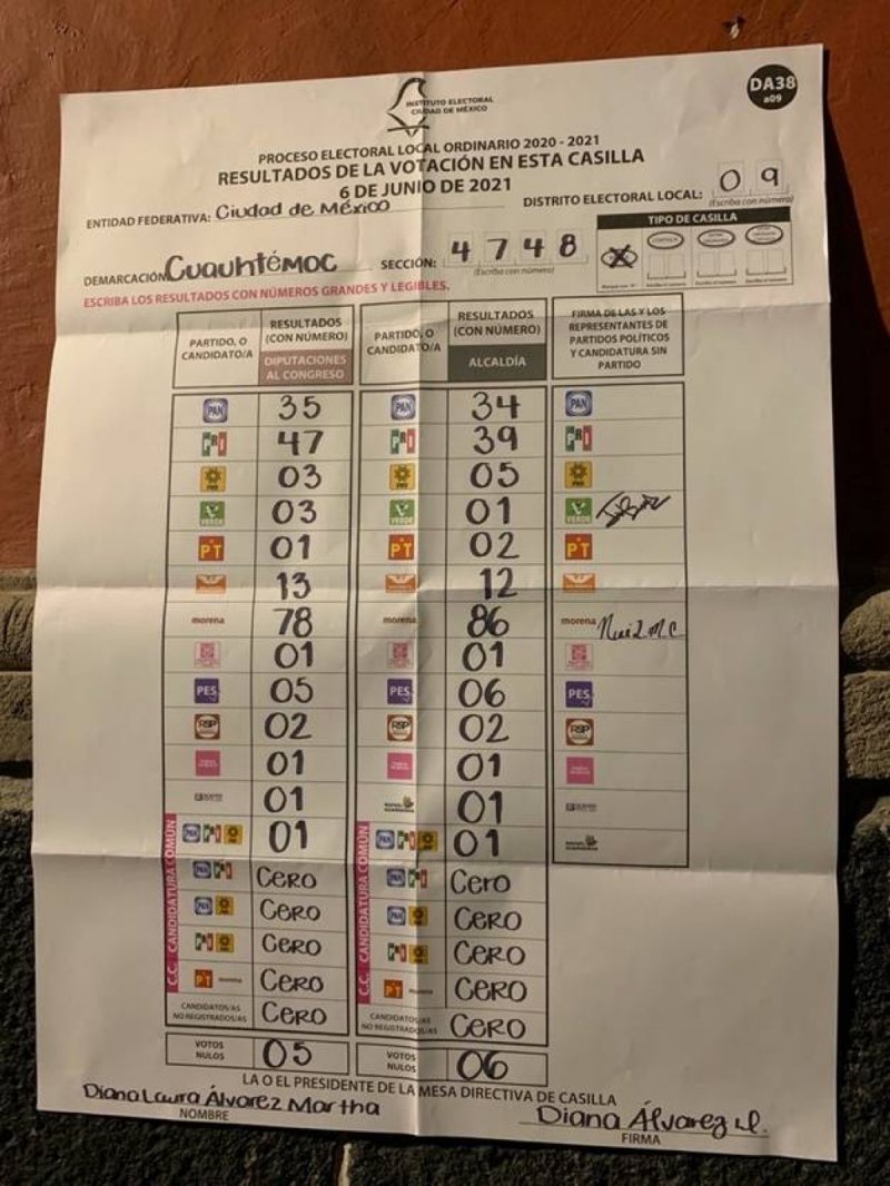 La casilla 4748 ubicada en la alcaldía Cuahútemoc en la Ciudad de México, el partido Morena fundado por López Obrador tuvo un triunfo arrollador.