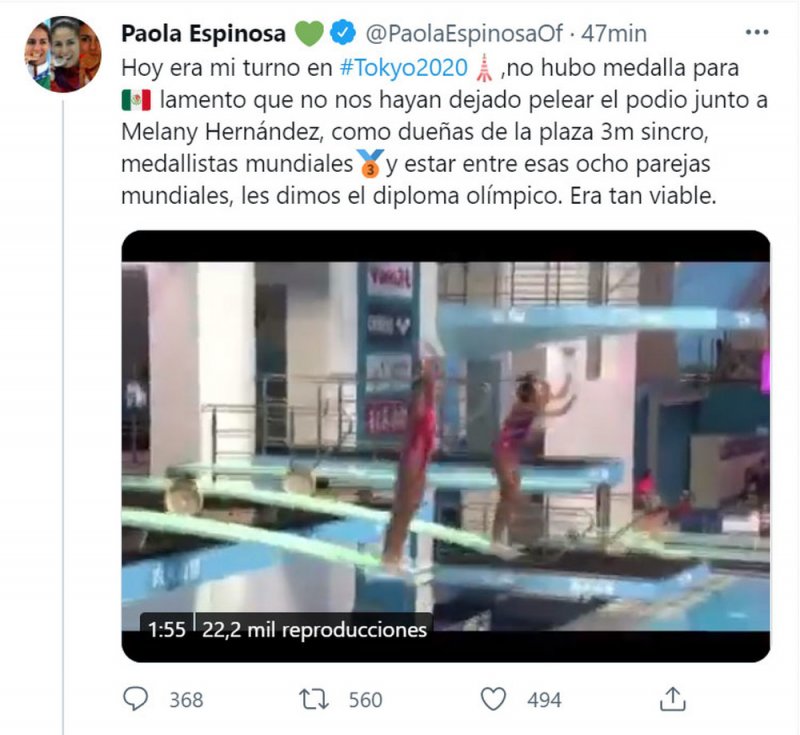 “Hoy era mi turno en Tokio 2020, no hubo medalla para México, lamento que no nos hayan dejado pelear el podio junto a Melany Hernández como dueñas de la plaza de 3m sincro, medallistas mundiales y estar entre esas ocho parejas mundiales, les dimos diploma olímpico. Era tan viable”.