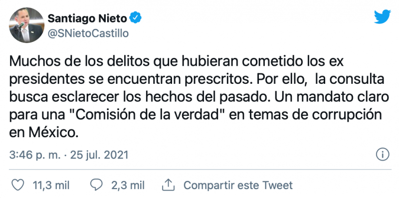 «Muchos de los delitos que hubieran cometido los ex presidentes se encuentran prescritos. Por ello, la consulta busca esclarecer los hechos del pasado. Un mandato claro para una ‘Comisión de la verdad’ en temas de corrupción en México.», señaló Santiago Nieto a través de Twitter.