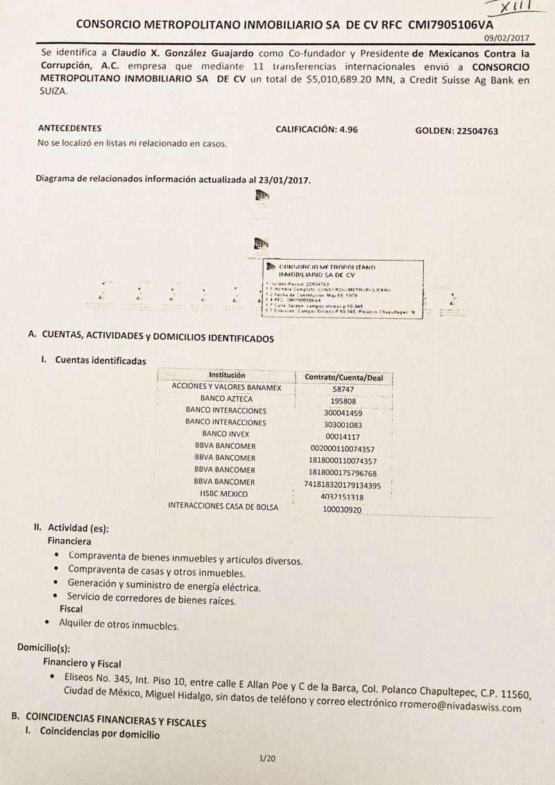 Las investigaciones señalan que las autoridades financieras identifican que Mexicanos Contra la Corrupción, AC, que se financia con donativos supuestamente “sin fines de lucro” (entre ellos varios millones provenientes de la embajada de Estados Unidos en México), realizó 11 transferencias internacionales por un monto de 5 millones 10 mil 689.20 pesos a una cuenta en Suiza del Credit Suisse Ag Bank, en beneficio de Consorcio Metropolitano Inmobiliario, propiedad de Andrés Holzer, cuya actividad es el alquiler de inmuebles.