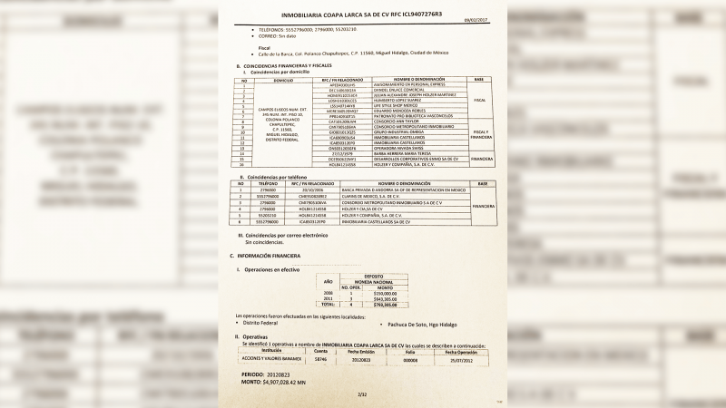 Además, entre los años 2004 y 2013, realizó operaciones por 5.9 millones de pesos. El expediente sobre este consorcio inmobiliario es voluminoso, registra transferencias internacionales por 840 mil dólares y depósitos por 25 mil 600 dólares; también identifican operaciones de transferencias desde Suiza por 17.9 millones de pesos, principalmente de la empresa de aviación Airbus Group México, con un 30 por ciento del total, y un 28 por ciento corresponde a Mexicanos vs Corrupción e Impunidad.