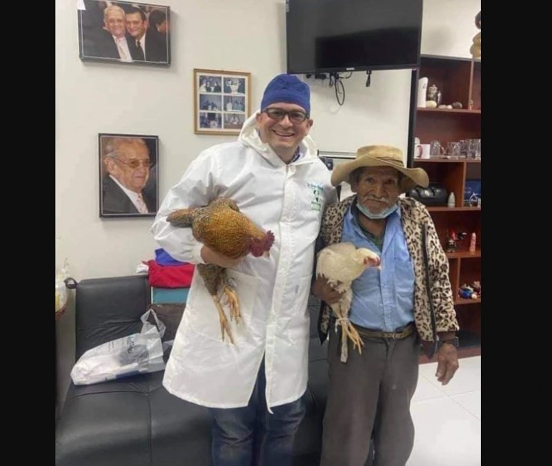 “Este abuelito no tenia dinero para operarse de próstata, a lo que respondí que lo vamos a operar por la fundación (...). Tal es mi asombro cuando saca de regalo 2 gallinas para retribuirme la atención, esto me emocionó y conmovió mucho.”