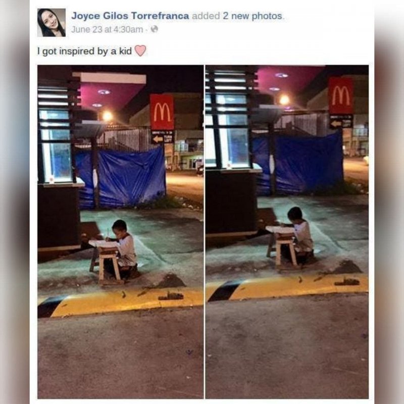 Que estaba en una mesita improvisada frente a McDonald‘s haciendo sus deberes escolares porque en su humilde hogar no tenía electricidad.