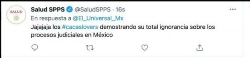 "Jajajaja los #cacaslovers demostrando su total ignorancia sobre los procesos judiciales en México", fue el texto que se publicó en respuesta a un tuit de El Universal.
