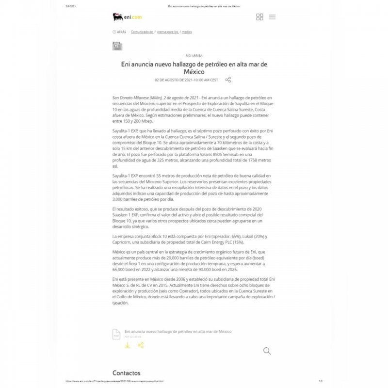 En la nota, ENI explicó que México “es un país central en la estrategia de crecimiento orgánico futuro de la compañía” y que “actualmente produce más de 20 mil barriles de petróleo por día desde el Área 1 y espera aumentar a 65 mil barriles diarios en 2022 y alcanzar una media de 90 mil en 2025”.