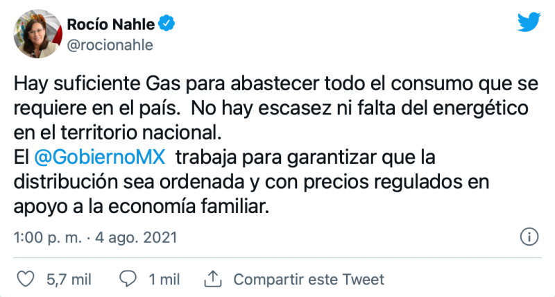 “Hay suficiente gas para abastecer todo el consumo que se requiere en el país. No hay escasez ni falta del energético en el territorio nacional. El Gobierno Federal trabaja para garantizar que la distribución sea ordenada y con precios regulados en apoyo a la economía familiar”, escribió la funcionaria en su cuenta de Twitter.