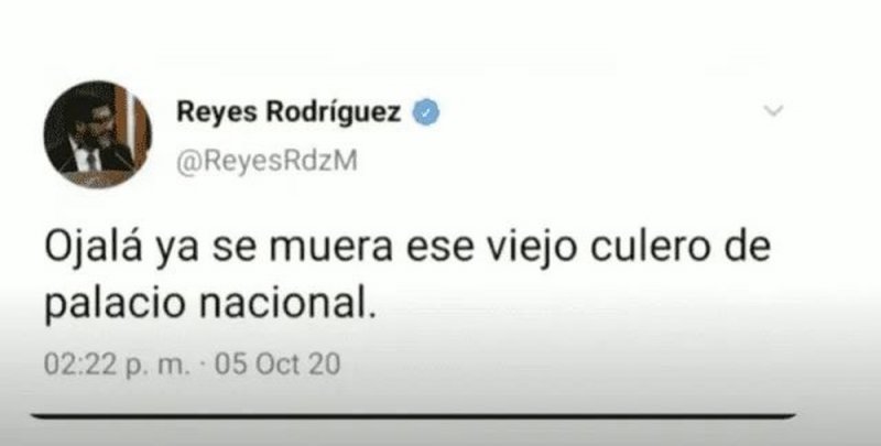 La publicación de Rodríguez Mondragón decía: “ojalá ya se muera ese viejo culero e palacio nacional”, haciendo referencia a Andrés Manuel quien mantiene su residencia en el edificio histórico.
