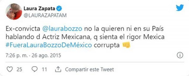 “Me complace saber q la Justicia divina acelera justicia en nuestro golpeado México. La vulgar y trinquetera #LauraBozzo en la cárcel, dará mucho gusto a @juarezvero c quien luchamos para sacar del aire el programa de la desgraciada donde humillaba niñas, niños y mujeres mexicanas”