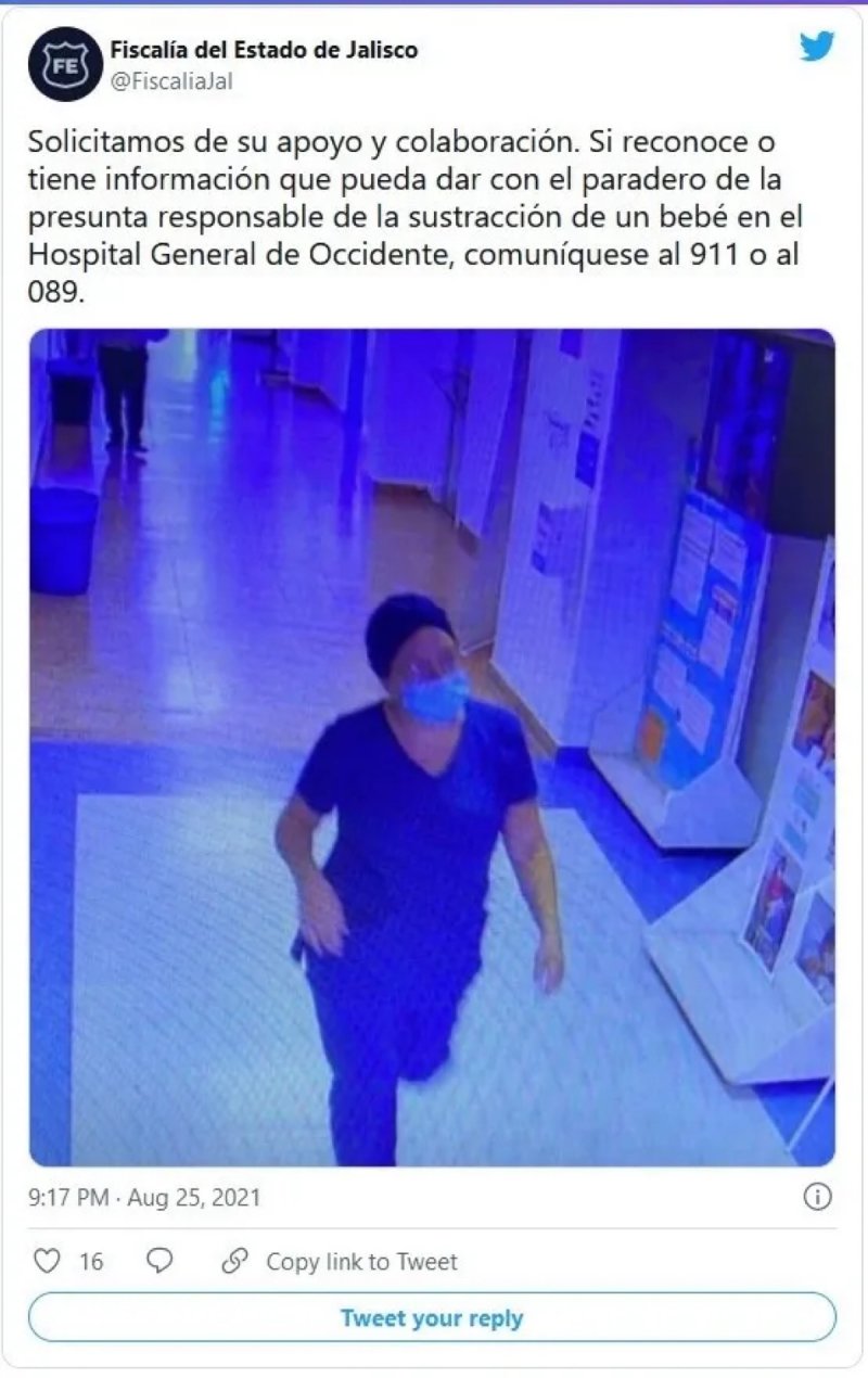Al respecto, el gobernador de jalisco en sus redes sociales que fue activado el Código Rojo en el Hospital y que se montó un operativo en todo el Estado para dar con la localización de la mujer señalada y del menor.