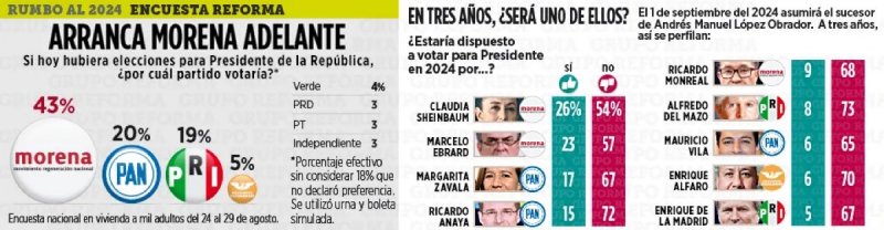 Una de ellas es la del diario Reforma, la cual fue publicada hoy y revela que si hoy fueran las elecciones presidenciales, Morena arrasaría con un 43% de las preferencias, seguido muy lejos por el PAN que tiene el 20%, el PRI que tiene un 19%, MC con el 5%, el Verde con un 4% y el PRD y el PT con el 3%.
