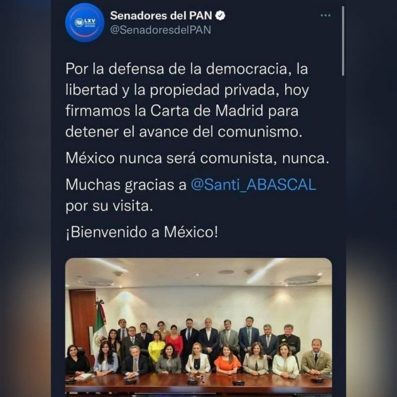 Desde la mañana de este viernes, la cuenta de Twitter de los senadores PAN eliminó la publicación en la que escribieron: “Por la defensa de la democracia, la libertad y la propiedad privada, hoy firmamos la Carta de Madrid para detener el avance del comunismo. México nunca será comunista. Nunca. Muchas gracias a @Santi_ABASCAL por su visita. ¡Bienvenido a México!”. El tuit estaba acompañado de una fotografía en la que lucían sonrisas, mismas que desaparecieron con la foto.