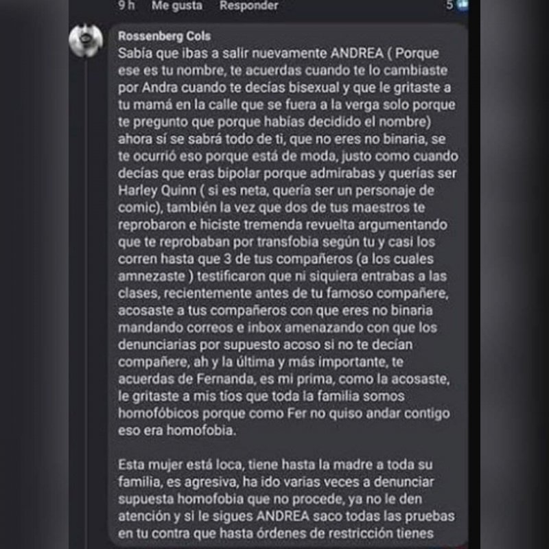 Andra sería, según Rosenberg, una acosadora pues tras ser rechazada por su supuesta prima Fernanda, elle armó un escándalo y acusó a todos de homofóbicos.