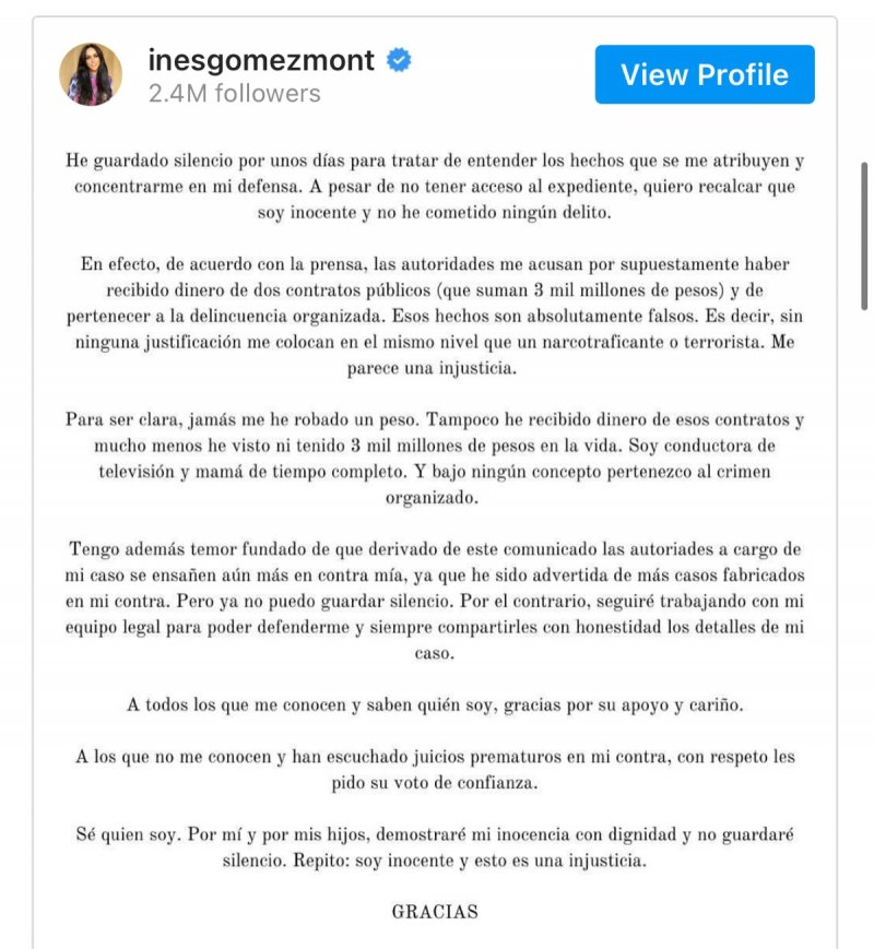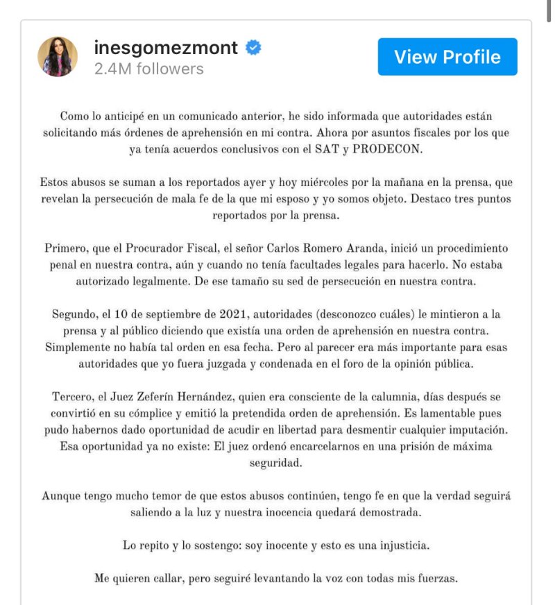 Por medio de un comunicado, Gómez Mont dijo que recibió la notificación de la solicitud de órdenes de arresto contra ella y su esposo por asuntos fiscales con el Servicio de Administración Tributaria (SAT) y la Procuraduría de la Defensa del Contribuyente (Prodecon).