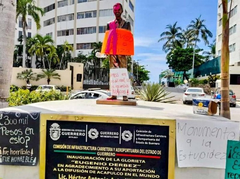 La polémica estatua de Eugenio Derbez en Acapulco, amaneció con carteles y manifestaciones en su contra.