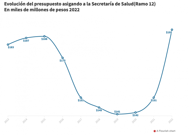 El gaso programable asignado a la Secretaría de Salud en el PPEF 2022 asciende a 192 mil 368 millones de pesos, lo que representa un incremento de 41 mil 558 millones respecto a lo aprobado en 2021 (+27.6%). Con este aumento, se alcanza el nivel más alto desde 2015 y se resarce el poco presupuesto asignado para el Ramo en 2020 y 2021, años iniciales de la pandemia.