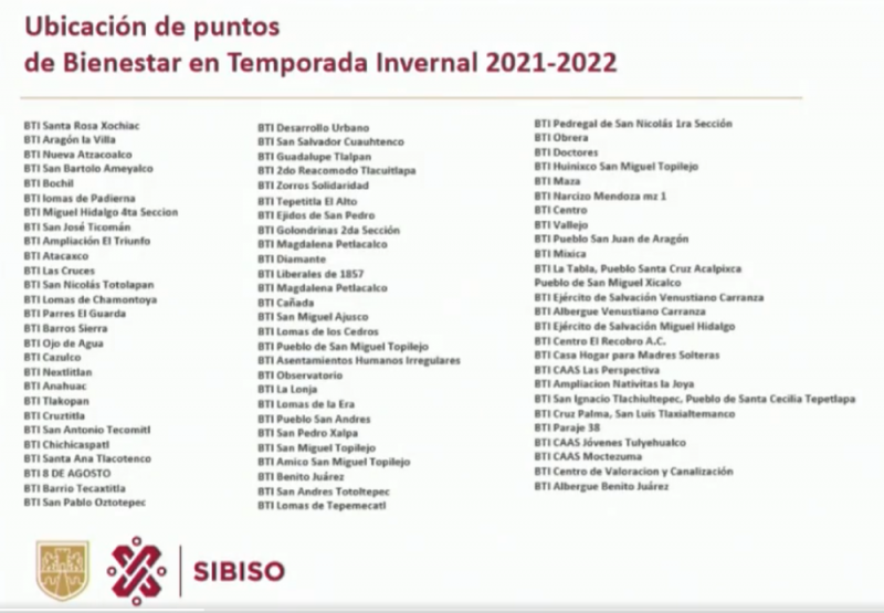 Los 80 puntos donde se apoyará con la Campaña invernal son los que se muestran en la siguiente imagen, sin embargo, estos pueden aumentar o modificarse debido a la demanda: