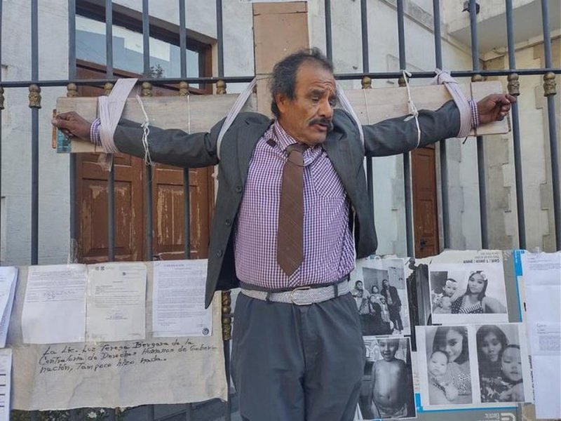 Sujeto se crucifica enfrente de la SEGOB para pedir ayuda por su hija secuestrada