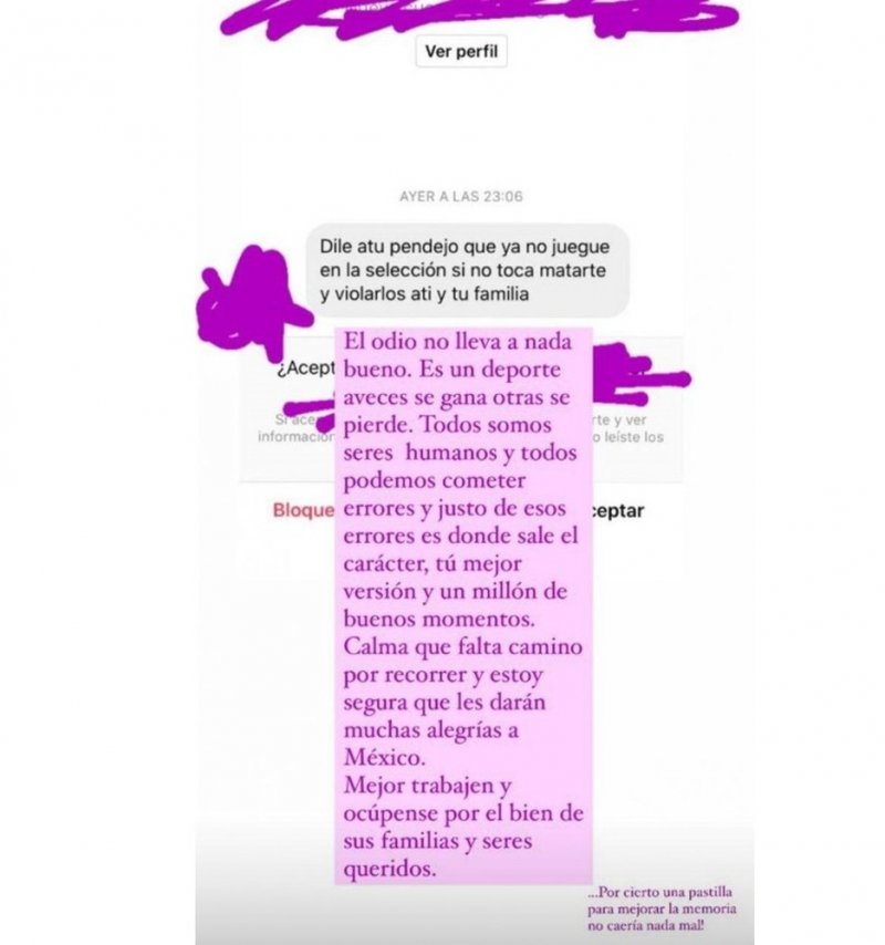 La modelo mexicana publicó una historia en su cuenta de Instagram donde hace registro público de la amenaza que recibió, la cual aseguraba que si Ochoa regresaba como guardameta en la Selección, este violaría y mataría a ella y su familia.