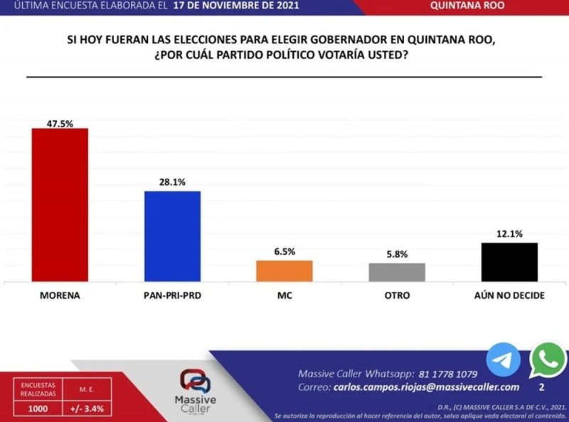 La casa Massive Caller difundió su más reciente encuesta del 17 de noviembre, en la que la alcaldesa del municipio de Benito Juárez, Quintana Roo, Mara Lezama, aparece en el primer lugar de las preferencias internas en Morena para la gubernatura del estado.