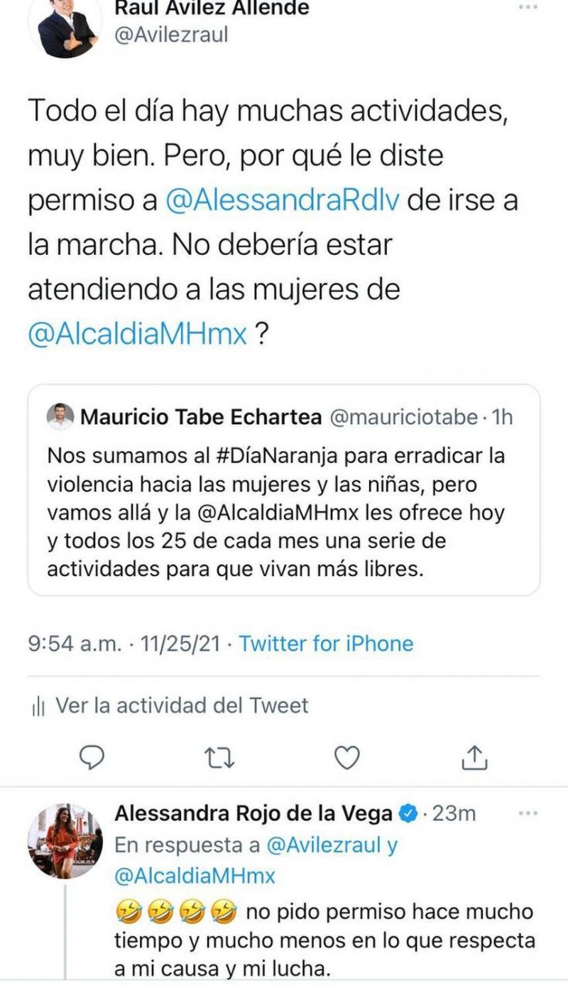 A pesar de qué en redes sociales le hicieron notar que la marcha feminista se llevará a cabo dentro de su horario laboral en la alcaldía Miguel Hidalgo de la ciudad de México, Alejandra Rojo de la Vega respondió de manera displicente mostrando que no le importaba tal situación
