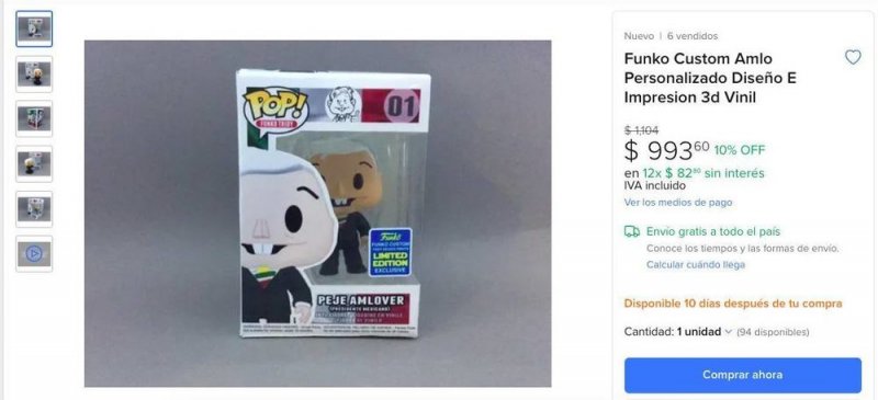 Mediante Mercado Libre el Funko de AMLO se ofrece en 993 pesos y hay tres diferentes modelos.