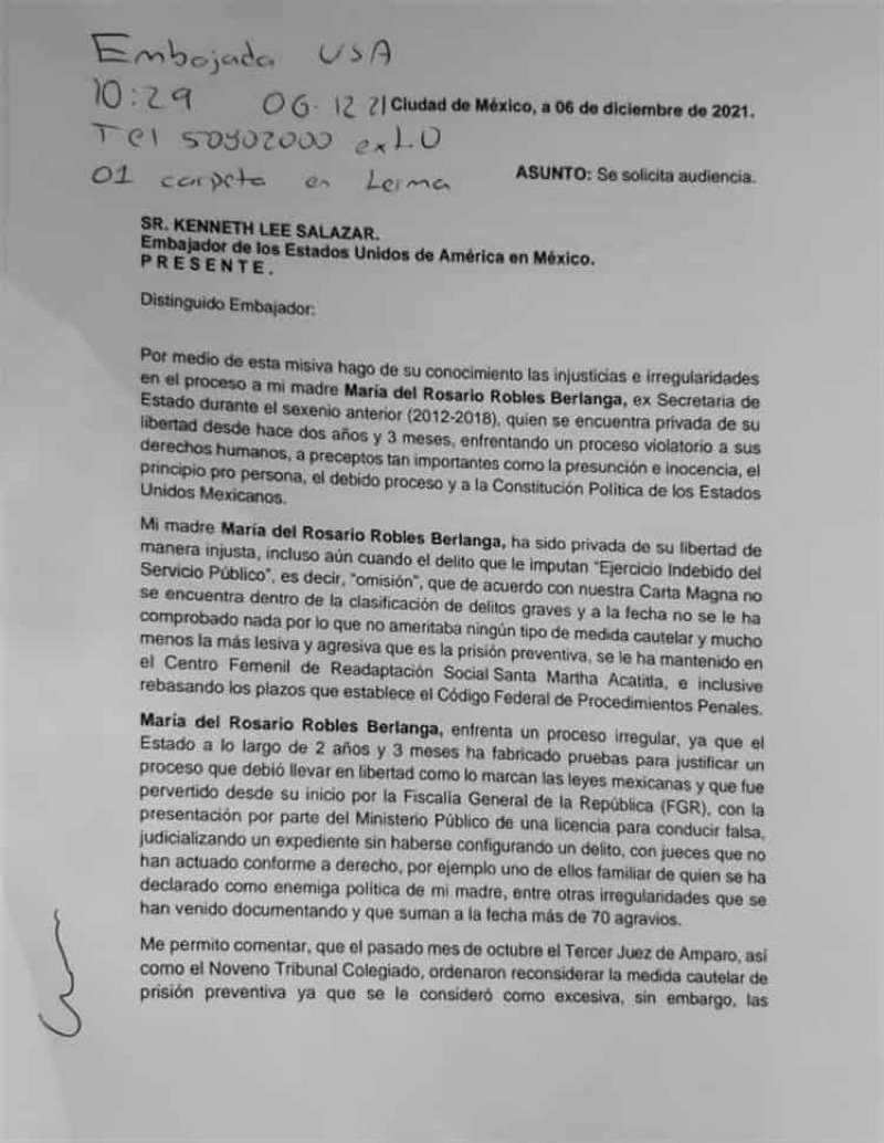 Mariana Moguel Robles, hija de la extitular de la Secretaría de Desarrollo Social (Sedesol) durante el gobierno de Enrique Peña Nieto, Rosario Robles Berlanga, envió una carta al embajador de Estados Unidos en México, Ken Salazar, en la que solicita una reunión con él para hacer de su conocimiento “las graves violaciones al proceso” de su madre.