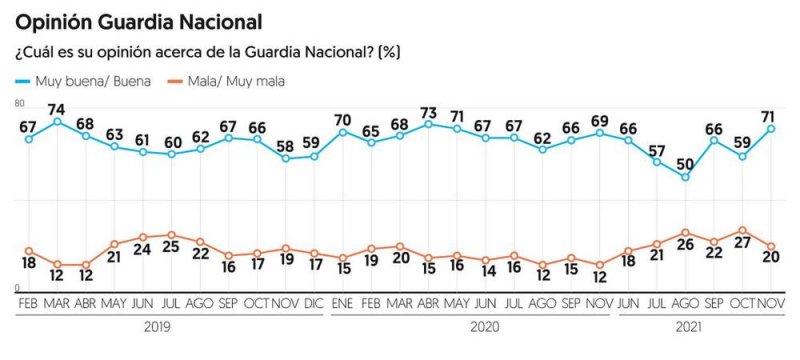 Con relación a la percepción sobre la Guardia Nacional, alcanzó 71 por ciento, un nivel comparable con los del inicio del actual gobierno, indicó el portal.