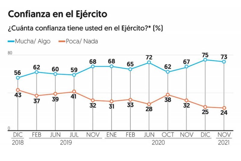 Sin embargo, el portal observa que la proporción de quienes no confían en el Ejército se redujo 20 puntos desde el inicio de la administración de AMLO.