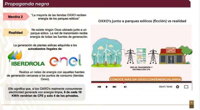 Otra mentira de la propaganda del Oxxo que los funcionarios de la CFE aclararon es que la mayoría de sus tiendas reciben energía eólica.