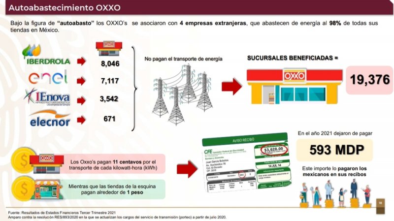 Asimismo, el funcionario mostró como Oxxo se beneficia de los “autoabastos” sin pagar la transmisión de electricidad brindada por la CFE.