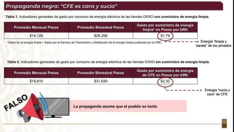 Uno de los argumentos que intenta disfrazar Oxxo es que paga menos por KWh que un hogar promedio. Además, acusa a la CFE de ser “cara y sucia” pues su energía se produce de forma contaminante y además a mayor precio que la “energía limpia”. Lo cual es falso y además es un intento por burlarse de la inteligencia de los mexicanos al no exponer la verdad sobe lo que se paga por la energía eléctrica.