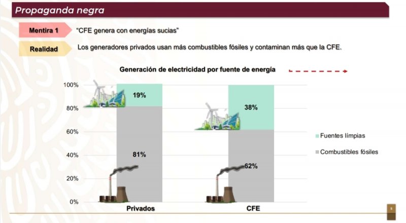 “CFE genera un 38% de energías limpias de su parque de generación. Hablamos entre comillas del 62% de combustibles fósiles. quiero decirles que en la CFE y también en los privados la mayor parte de estos combustibles fósiles es gas.”