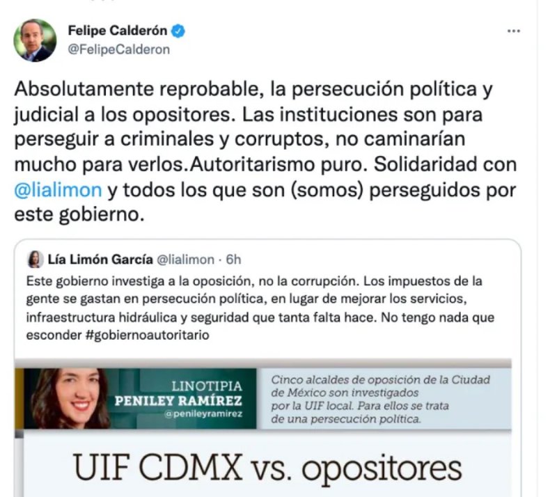 El expresidente Felipe Calderón Hinojosa se solidarizó con la Alcaldesa de Álvaro Obregón, Lía Limón, por la presunta investigación que realiza la Unidad de Inteligencia Financiera (UIF) capitalina en su contra y aseguró que él también es “perseguido por este Gobierno”.