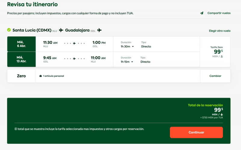 Si uno cotiza en Viva Aerobús el vuelo redondo CDMX-Guadalajara para abril, el costo total, ya con todos los impuestos incluidos, sería de 829 pesos.