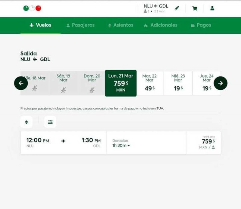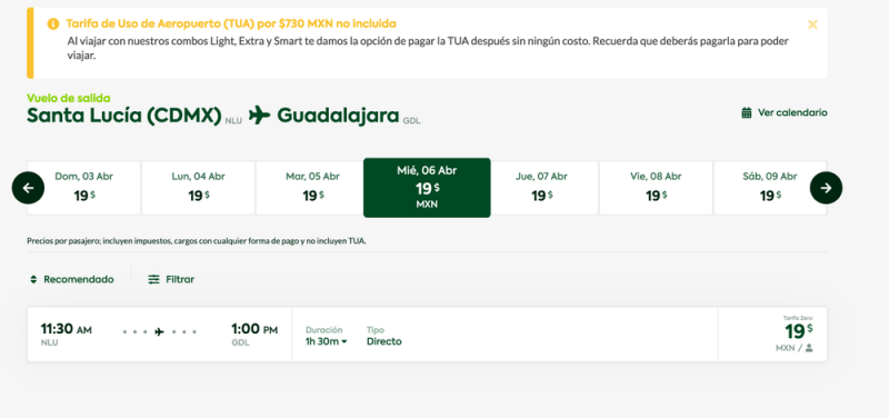 De acuerdo con la información recabada por Polemón, el primer vuelo comercial que despegará del AIFA saldrá con dirección a Guadalajara a las 12 horas. El costo de este primer viaje (Viva Aerobús) cuesta de 759 pesos más la Tarifa de Uso de Aeropuerto (TUA), sin embargo los días siguientes el precio baja a 49 y 19 pesos más TUA.